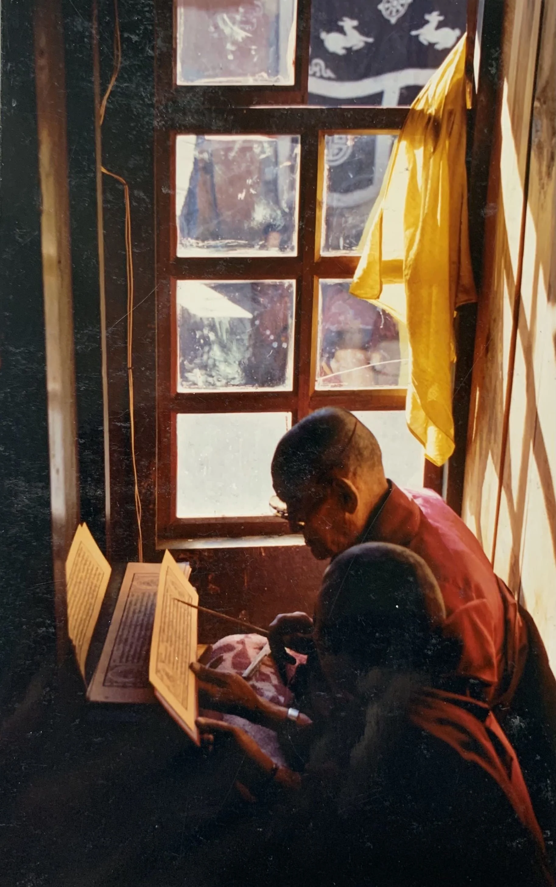 Elder monk leading young novice reciting prayers, Thubten Choling Monastery. (Photo by N. L. Drolma)