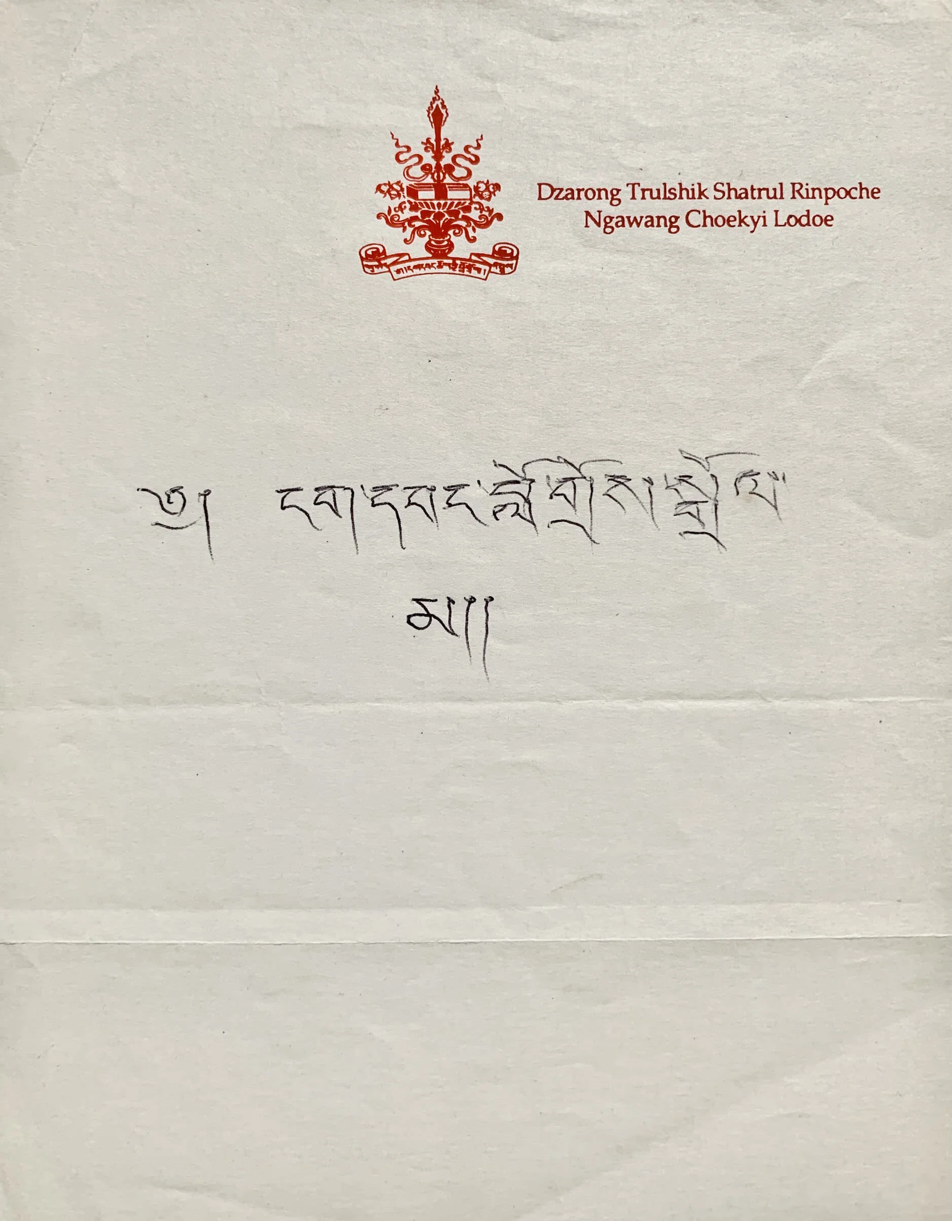 “Ngawang Lodrö Drolma,” name given by Trulshik Rinpoche and written on official letterhead at time of ordination.