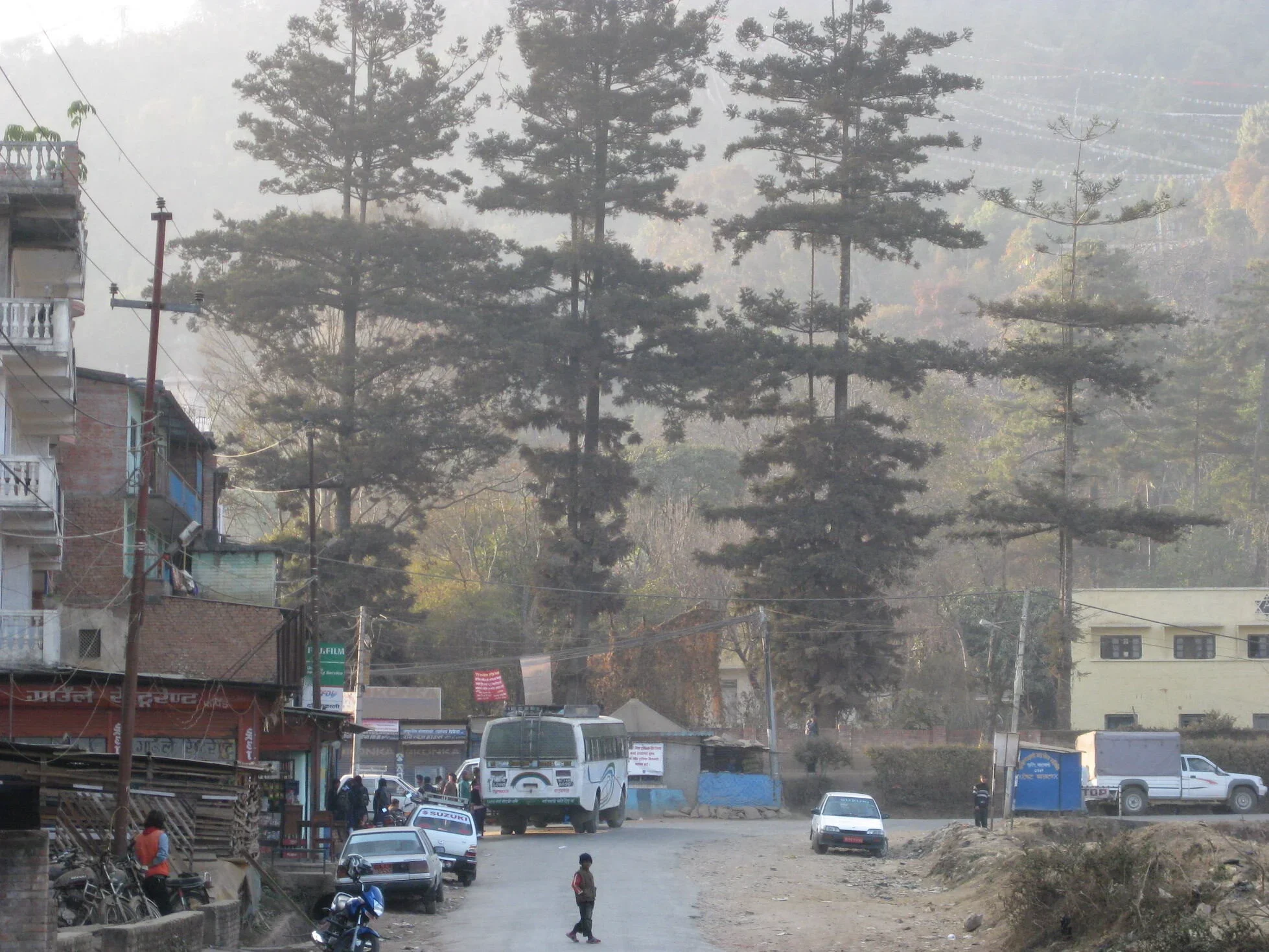 Impressive evergreens at bus stop/taxi stand, Pharping, Nepal (Photo by N. L. Drolma)