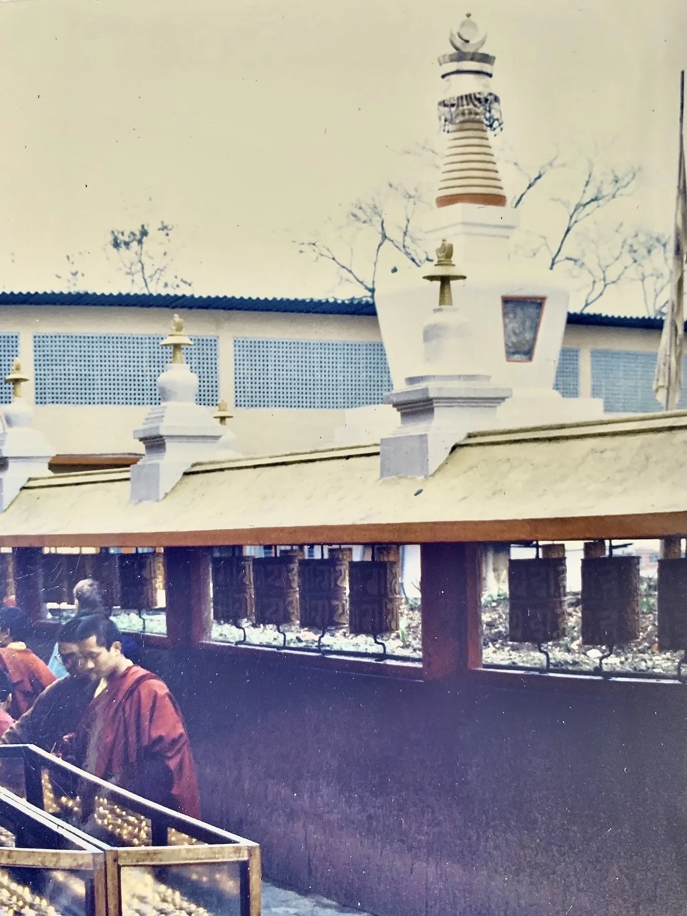 Monks, butter lamps and prayer wheels, Chorten Gompa, Gangtok, Sikkim ~ 1998 (Photo by N. L. Drolma)