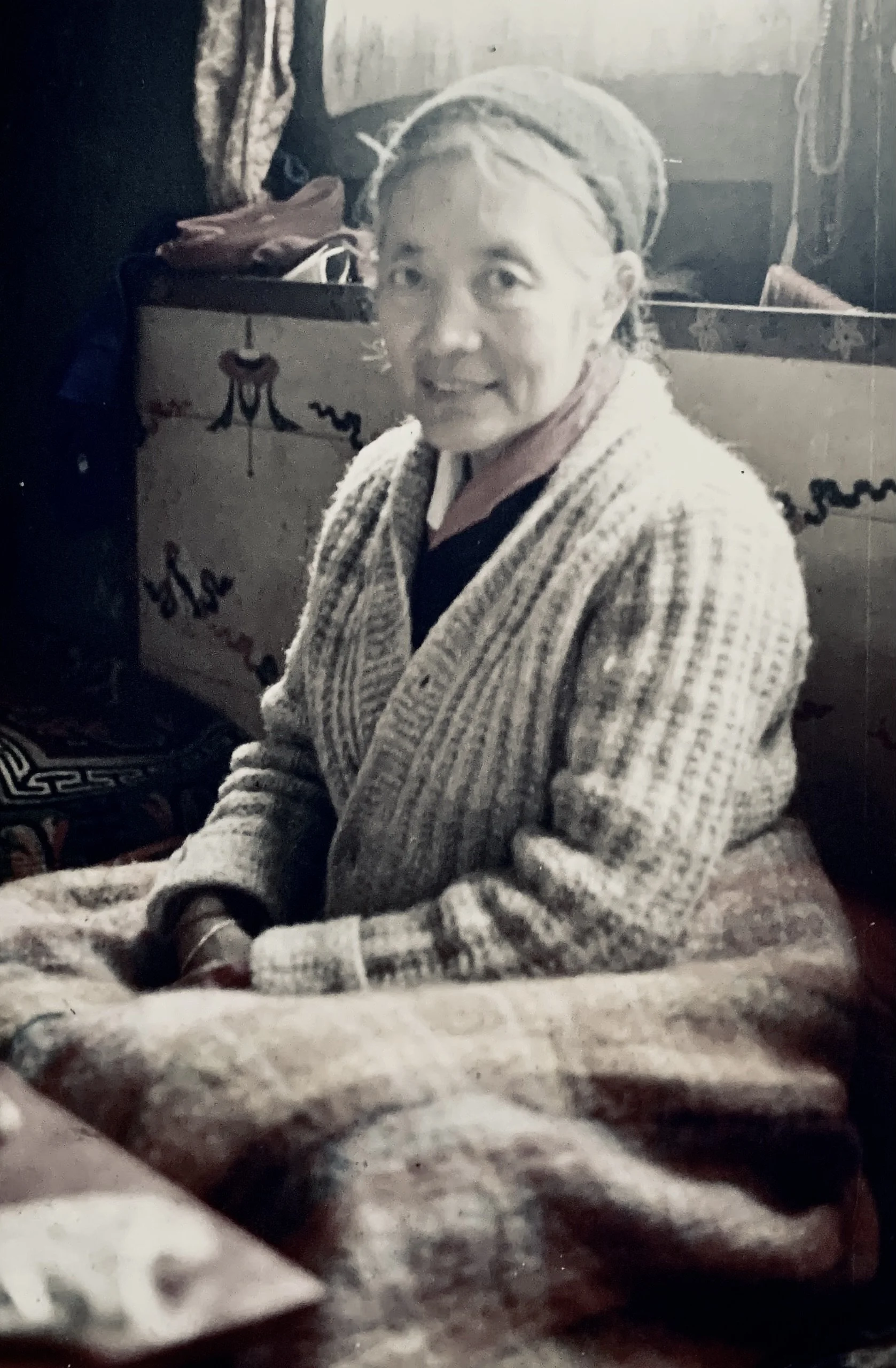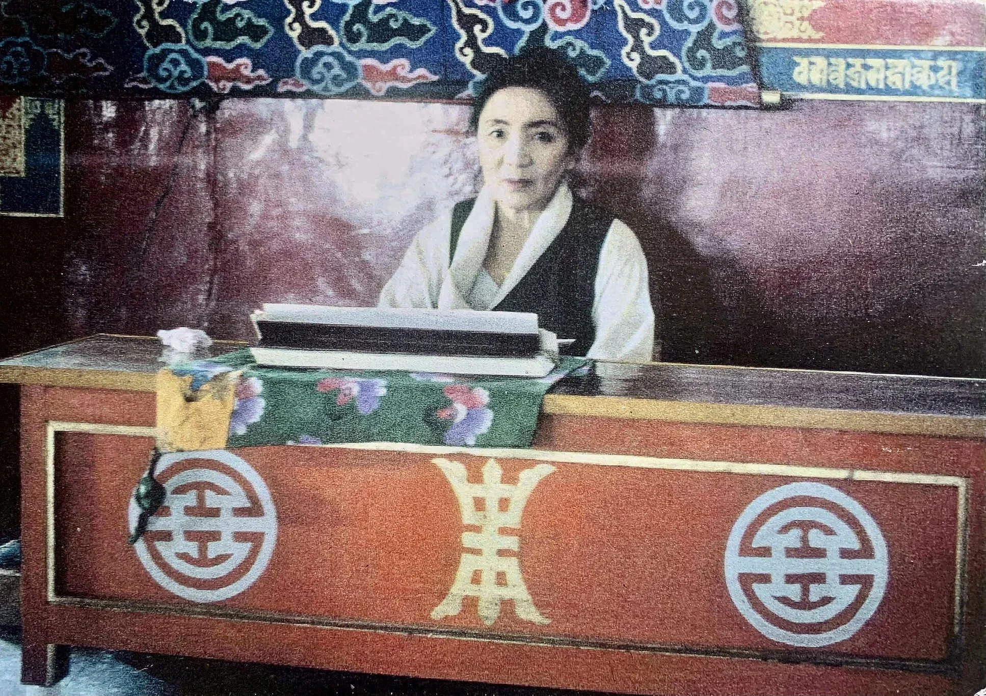There was no furniture, only a single futon on the floor covered by a Tibetan carpet, and two brightly painted chokste (low set Tibetan tables) that served as a support for daily prayer books, alarm clock, and teacup. Khandro was the spiritual wife of the revered Tibetan master, J. Khyentse Chokyi Lodrö. She slept at the base of an elaborate shrine featuring a life-size bust in his likeness and a large jewel-studded golden reliquary. The room was lined with pechas (Tibetan prayer books) from floor to ceiling, and its hardwood floor had a polished, aged beauty unto itself—as if all who had visited there over the years had fashioned by their prayers and prostrations a unique patina, crowned by Khandro’s daily practice.