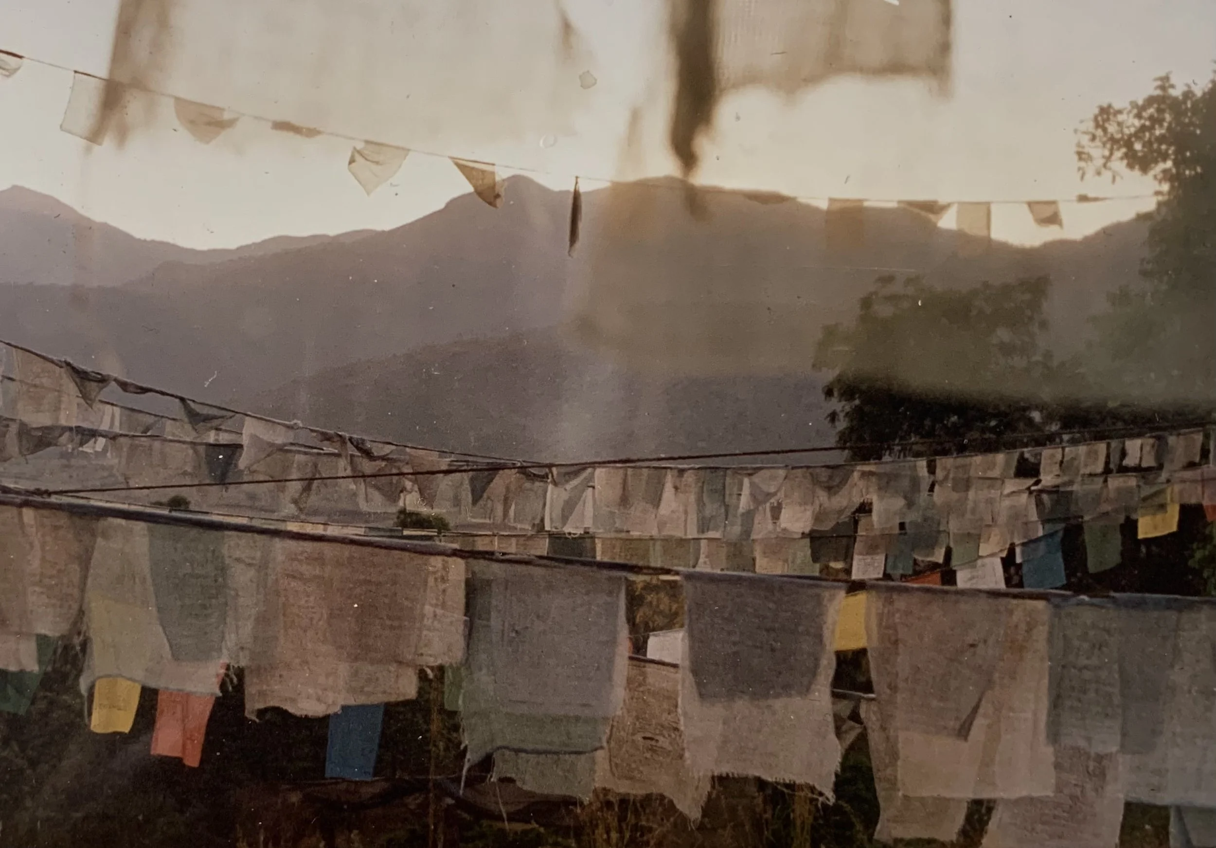 Few yards away from the temple was a makeshift gray tent. Tibetans, lay and ordained, were sitting cross-legged on the ground near large metal vats of boiling water. Several members of the community were engrossed in conversation while others were sipping tea and watching two young boys play in the dust. A lone deer wandered among the monastery’s dogs—a sight that suggested the birthing of a parable. One afternoon, I counted eleven dogs lazing in the shade of the temple’s walls.Some of us ambled onto land that bordered the monastery—terrain under the auspices of HH the Dalai Lama—a sunbaked orchard of prayer flags beautifully muted in color, whose muslin garlands seemed to outnumber the vast tangle of branches