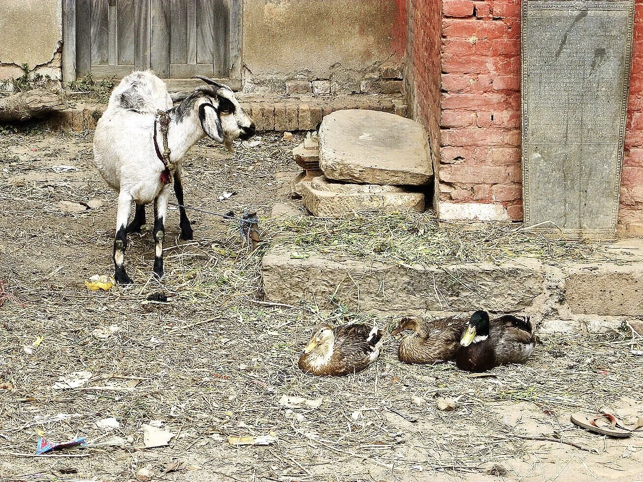Tethered goat eyeing sitting ducks, Pharping, Nepal (Photo by N. L. Drolma)